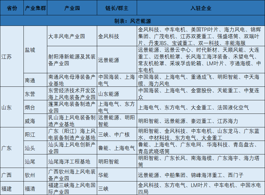 其中,多为单个设备制造商海上风电制造基地或风电产业园,能称得上产业集群并不多。产业集群突破了企业和单一产业的边界,着眼于一个特定区域中,具有竞争和合作关系的企业、相关机构、政府、民间组织等的互动。产业集群能从整体出发挖掘特定区域的竞争优势,将是推动未来区域经济增长的“加速器”。风芒能源根据公开信息整理了沿海十个城市最具代表性海上风电产业集群。