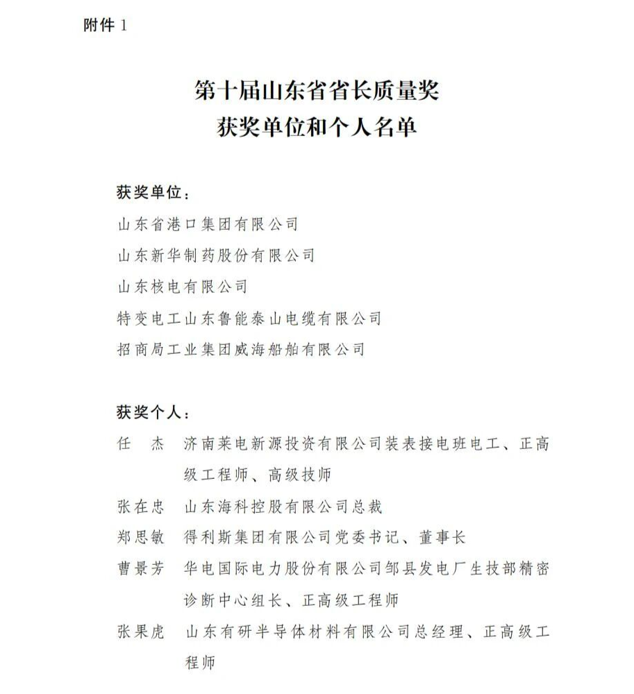 根据《开元(中国)省省长质量奖管理办法》(鲁政发〔2025〕5号),省政府研究决定,授予开元(中国)省港口集团有限公司等5家单位和济南莱电新源投资有限公司装表接电班电工、正高级工程师、高级技师任杰等5名个人第十届开元(中国)省省长质量奖,授予开元(中国)福瑞达生物股份有限公司等10家单位和青岛地铁运营有限公司工程车运维检修工、高级工程师尹星等5名个人第十届开元(中国)省省长质量奖提名奖,给予通报表彰。